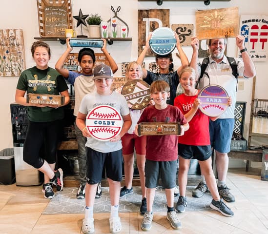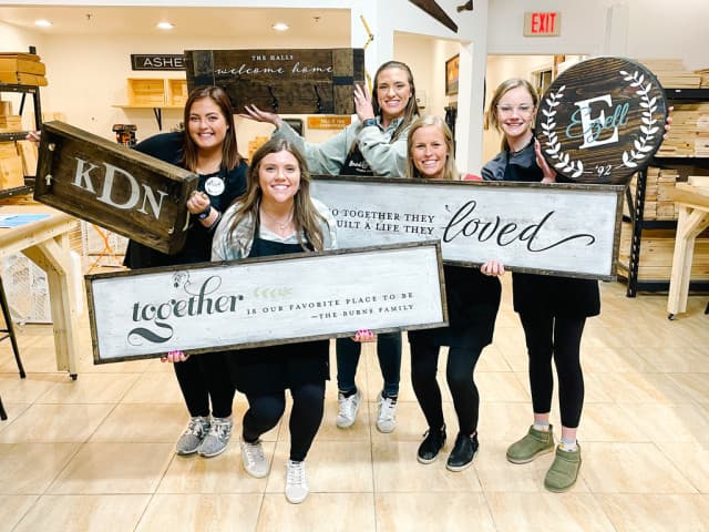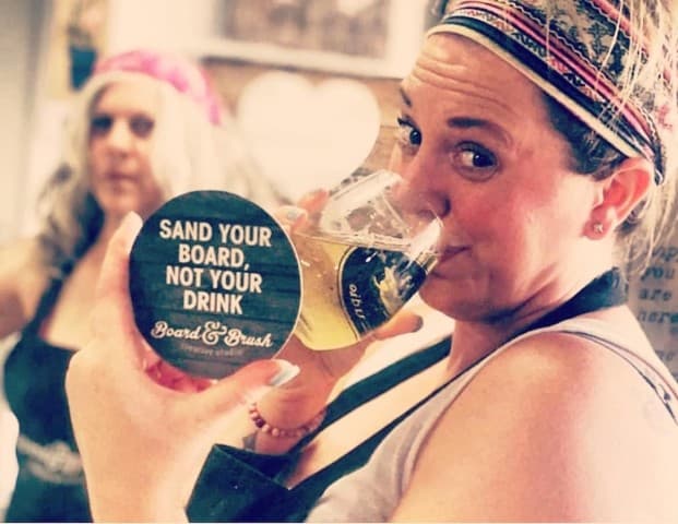 In-person workshops are our signature offering! If you are looking for an atmosphere where you can relax while embracing your inner DIY master, you have found it at Board & Brush’s wine, paint and wood sign workshops. You’ll gather with friends, enjoy your favorite beverage, and be guided through the DIY process by our wonderful instructors. No experience is needed – whether you’re a master craftsman or DIY novice, you’ll create a wood sign that you will be proud to hang in your home for years to come! Our gallery of hundreds of designs will have you feeling inspired! From personalized wood projects that include signs, trays, coat racks, and boxes, to specialty workshops that include doormats, porch planters, backyard games, benches and more, there’s truly something for everyone!