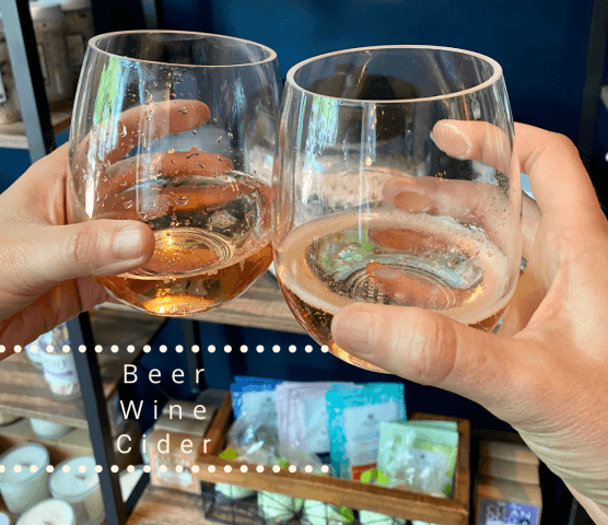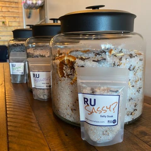 Recline & Unwind showcases a retail boutique with a variety of beverage options, and spa-related items including house made Salty Soaks in their Signature scents of RU Mellow?, RU Sassy? and RU Peppy?